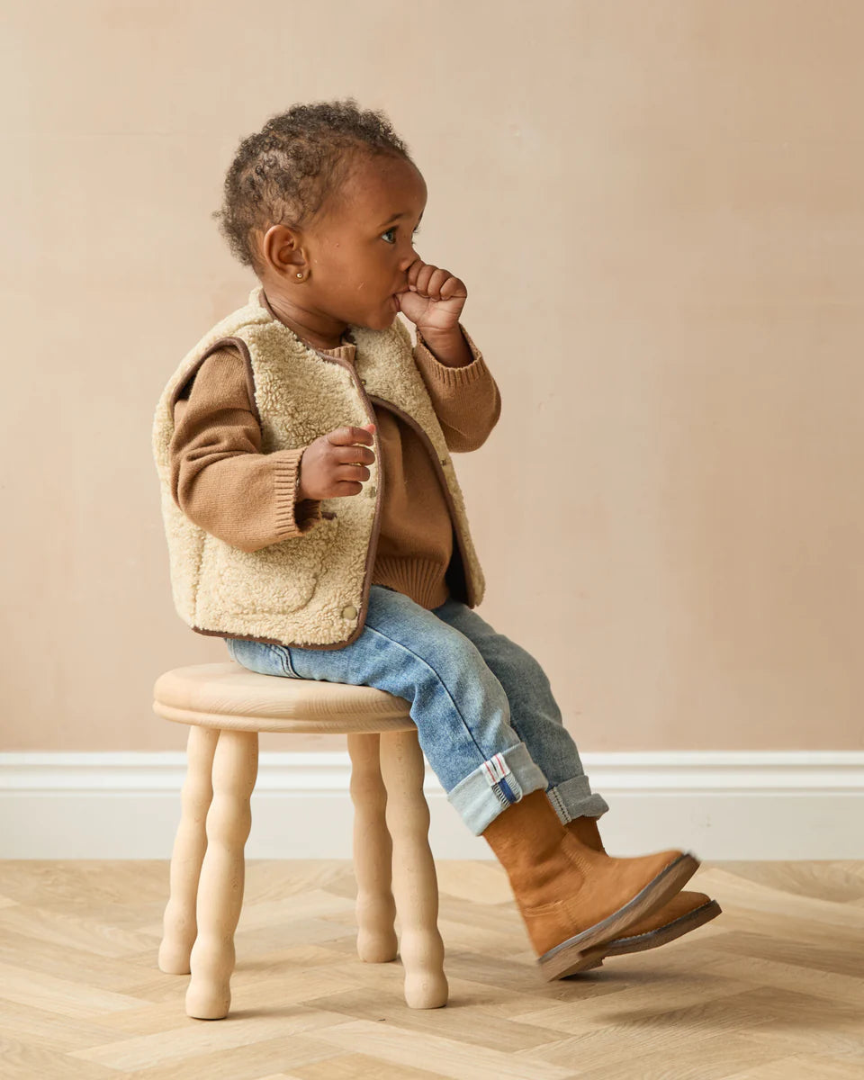 Lamb Gilet is the perfect mix and match item! Made in a super soft tactile sherpa with contrast binding and front patch pockets. With antique brass popper fastenings.